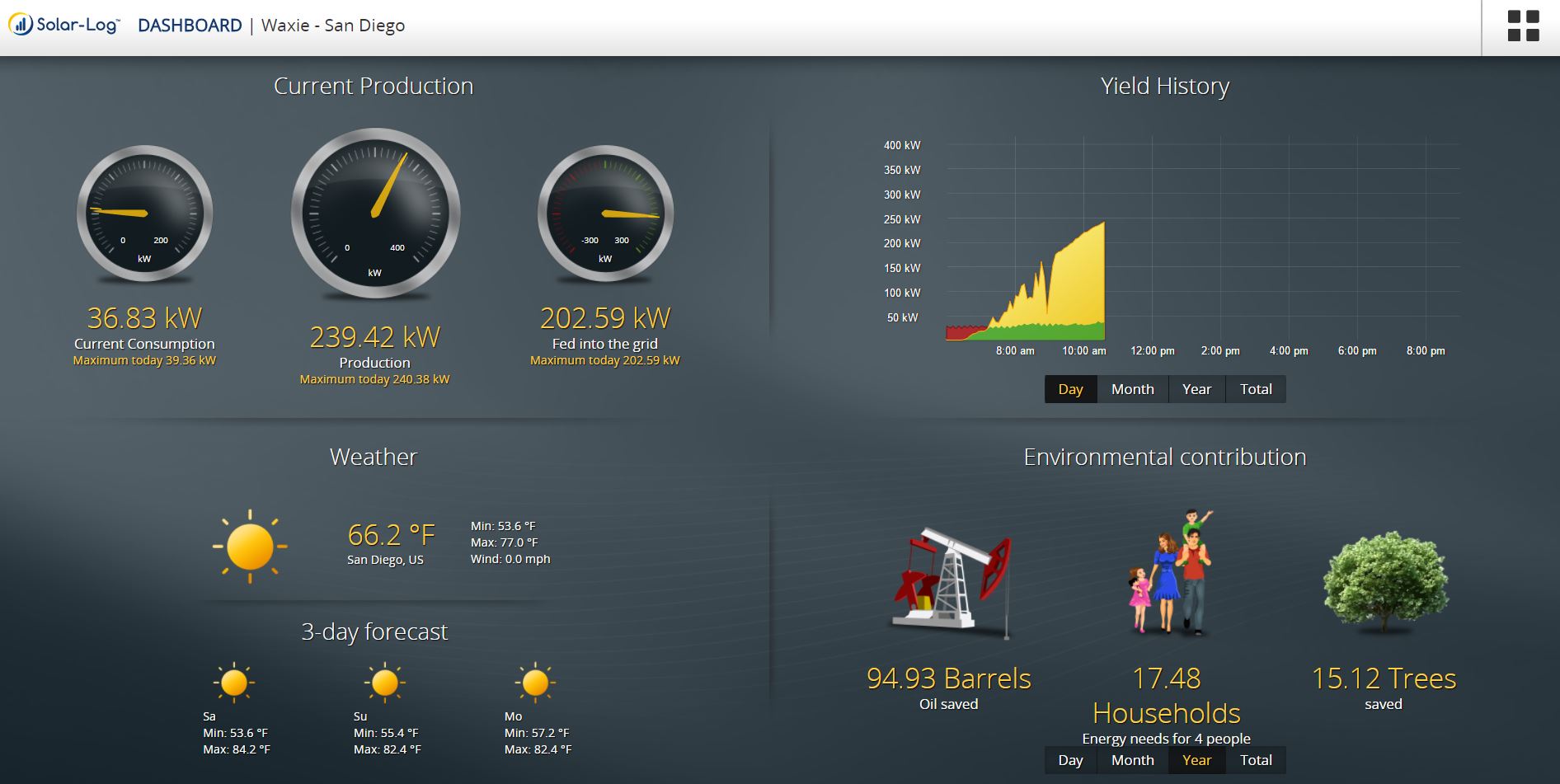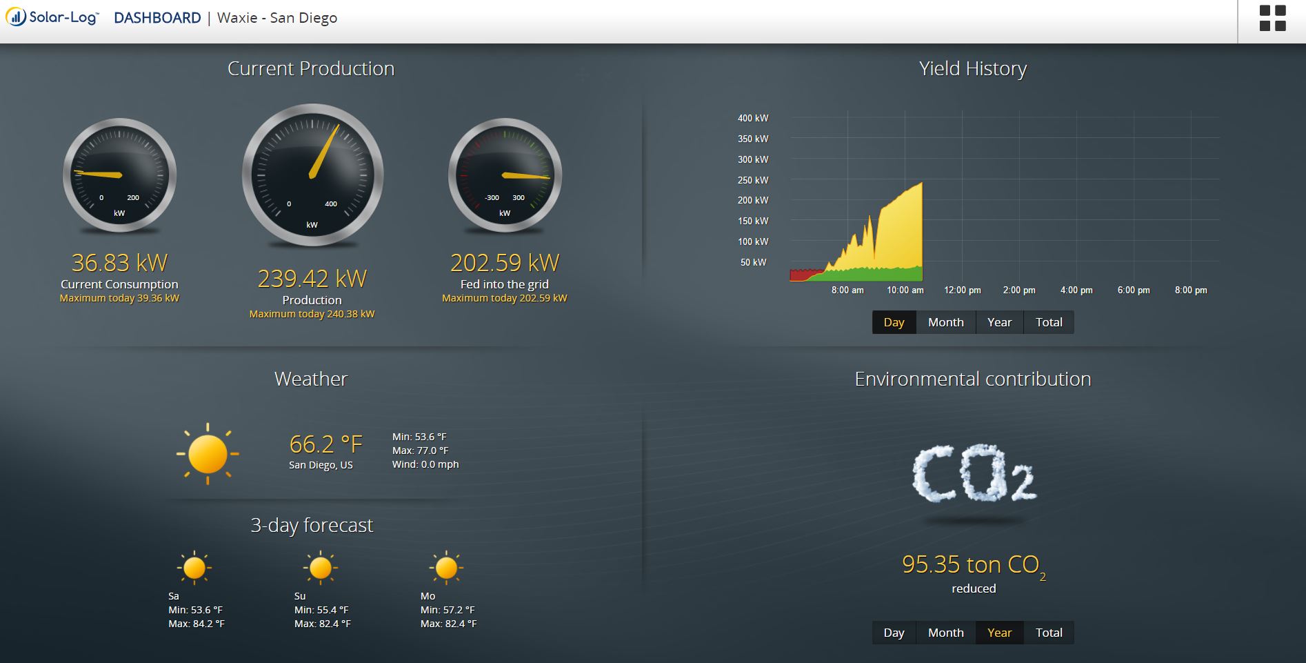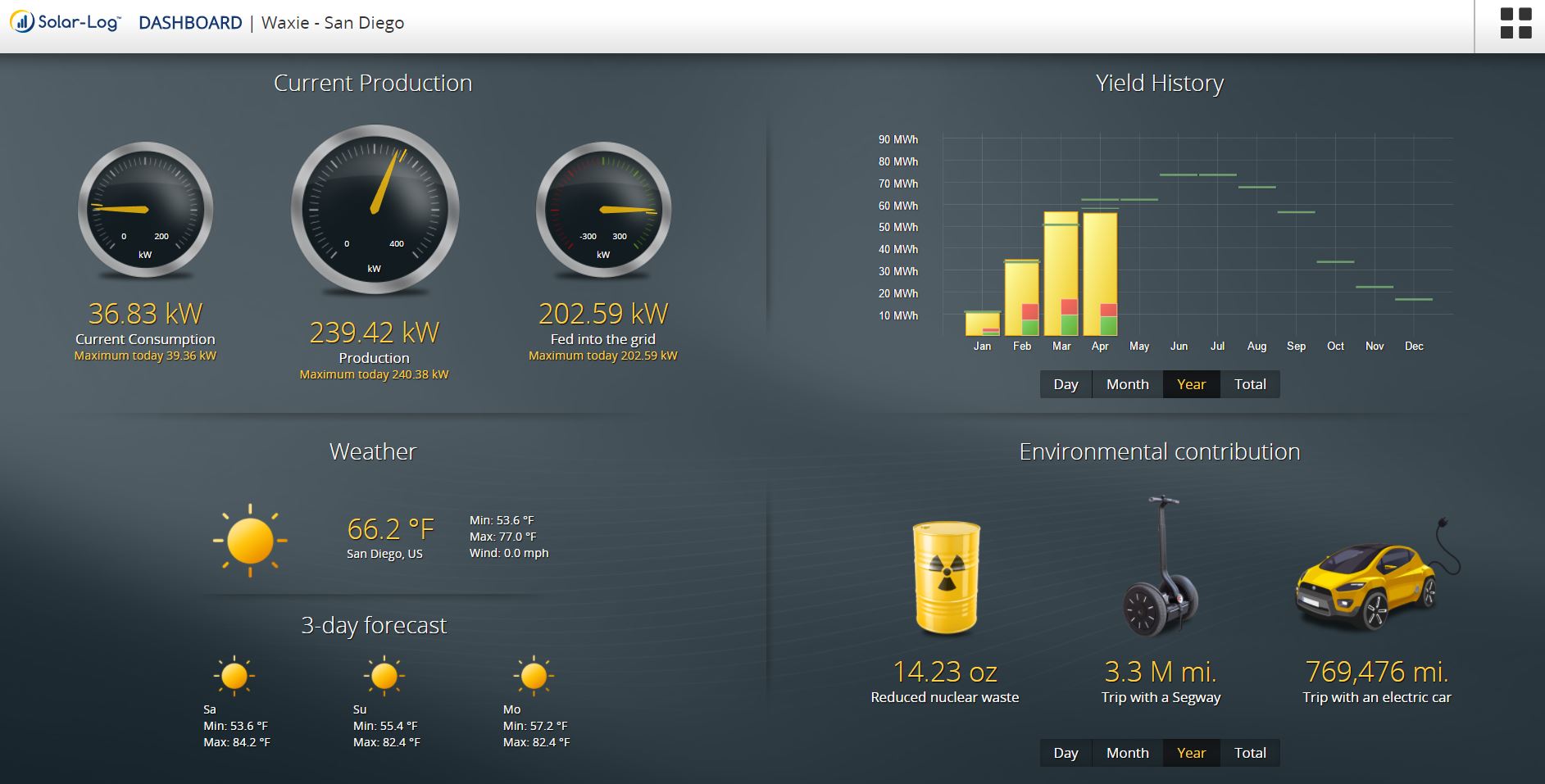 We also installed two commercial solar systems for Waxie Sanitary Supply at their San Diego and Ontario locations in 2014. Waxie is committed to reducing and conserving energy usage, they are a local leader in California and we were honored they chose to go green with Palomar. They have been more than satisfied with their solar production, utility savings – San Diego already has saved $234,000 in two years and Ontario is at a savings of $136,000 just in the last 18 months, and the environmental benefits. Here are some fun numbers for the Waxie San Diego project, from the last year alone.